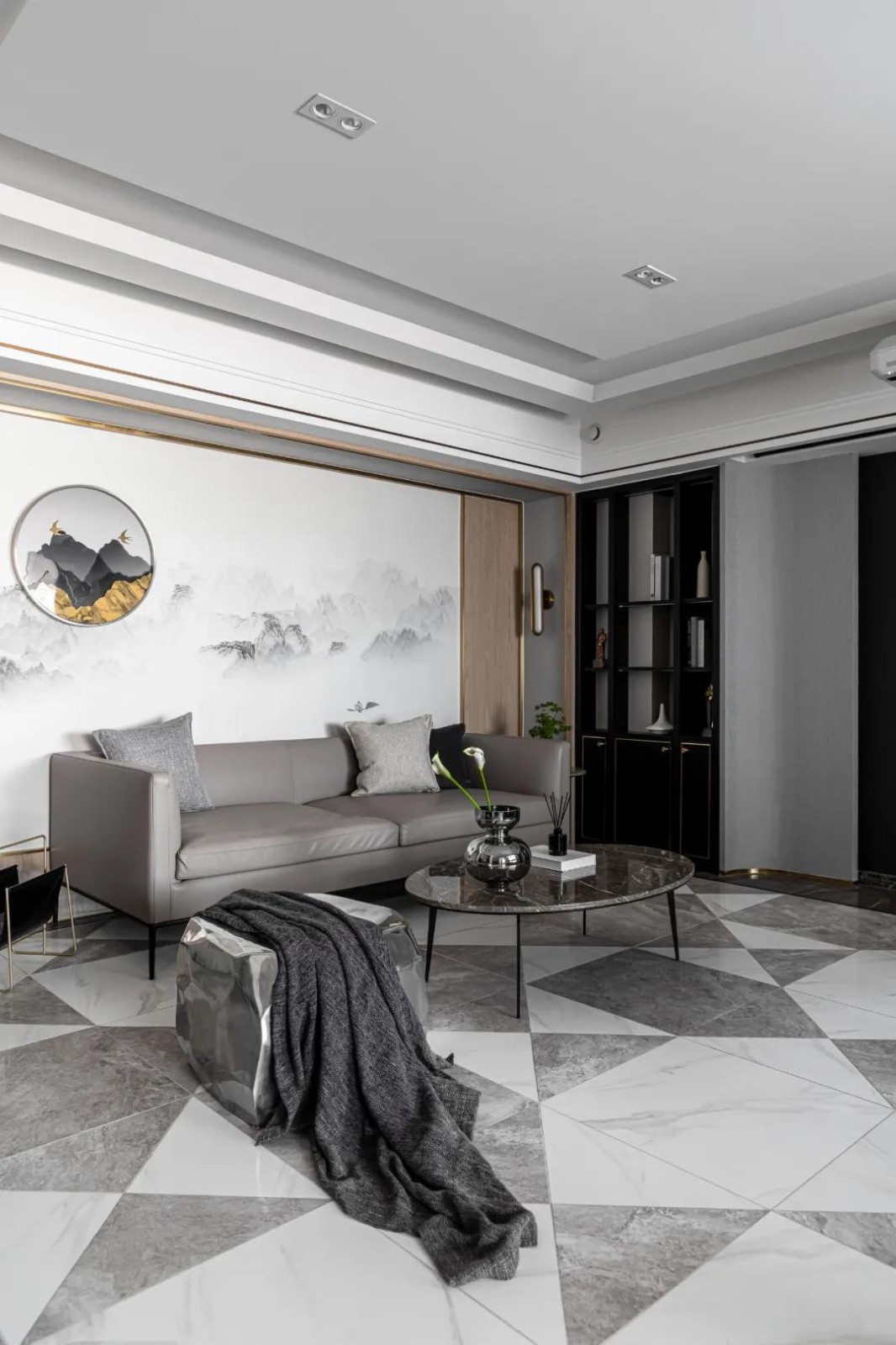 层次丰富的黑色展示柜, 加入精致感满满的金属元素, 中和了沙发区域水墨画的柔美感, 兼具置物展示与收纳的需求,
