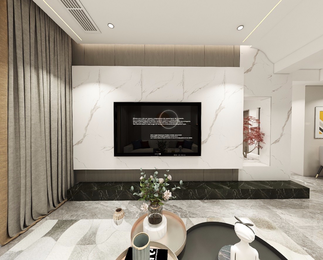 客厅大理石与深色木饰面搭配,打破传统设计,镂空展示背面小景观,顶面挑高做无主灯设计,弧形吊顶过渡层高高差