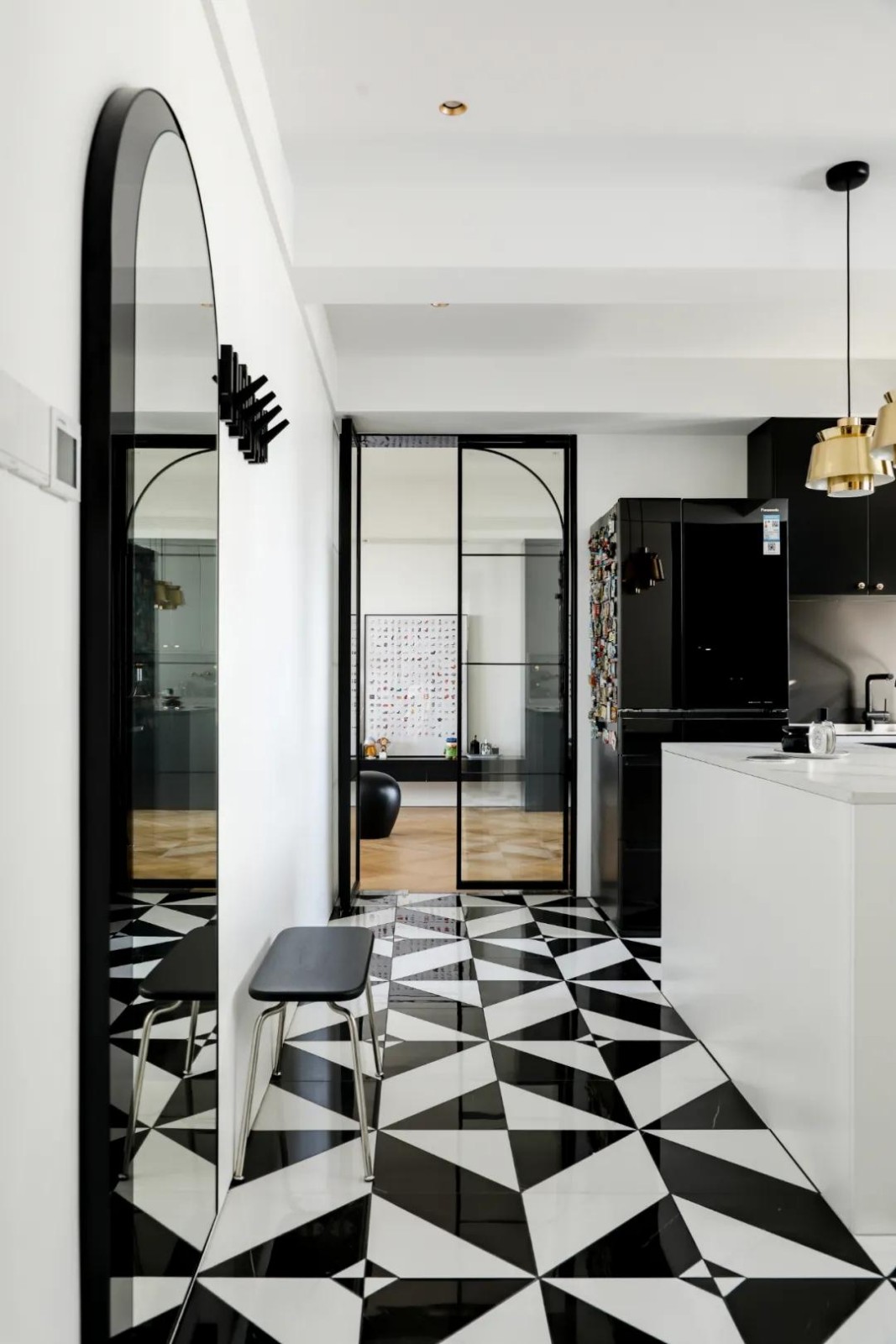 入户***眼, 被精致黑白配吸引, 像是走入摩登家园一般, 原户型厨房区域狭小, 空间局促且利用率不高, 因此将入户区纳入, 空间也变得无遮挡明朗起来。