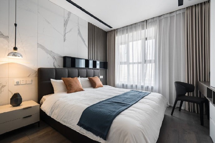主卧以古朴的淡雅粉色为主,床头前的山水意境图与渐变色地毯相之呼应,唯美而静谧。宽阔的露台,拥有***的视野与采光,一幅美好的生活愿景图,正在当下上演