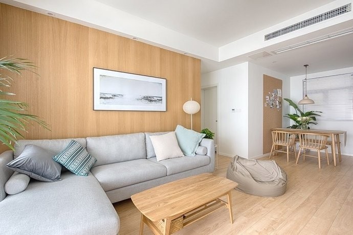 客厅整体装修很简洁,顶面和电视墙区域墙面都是普通的大白墙,沙发区域用木板上墙做装饰,墙面的木板与地板同色,显得统一大气!客厅区域的家具很简单,浅色布艺沙发搭配细腿茶几,电视墙区域用隔板代替电视柜,物品虽然多但丝毫不占空间。