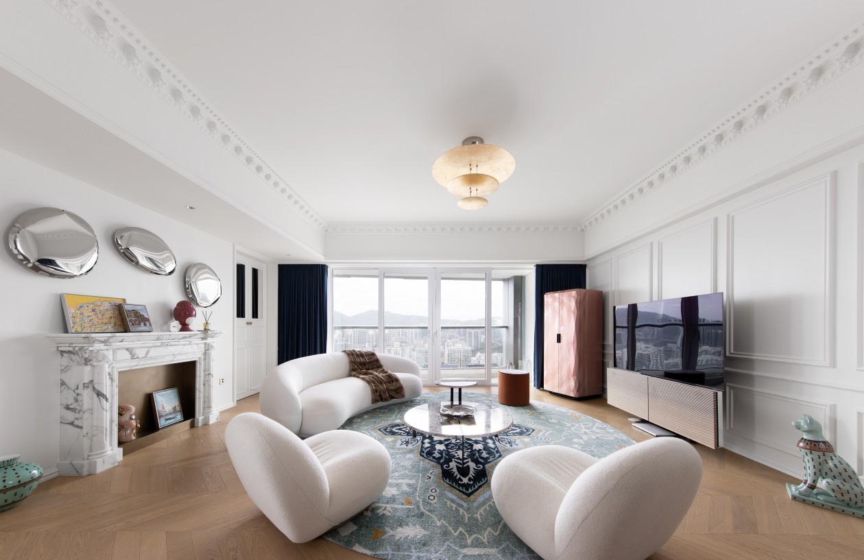 用现代的设计手法,采用开放式布局,选用Tacchini和Gubi米白色沙发围合出一种优雅浪漫的设计共感,在这里,现代家具被赋予更多质感,与屋主喜好的精致饰品化身为艺术新潮。