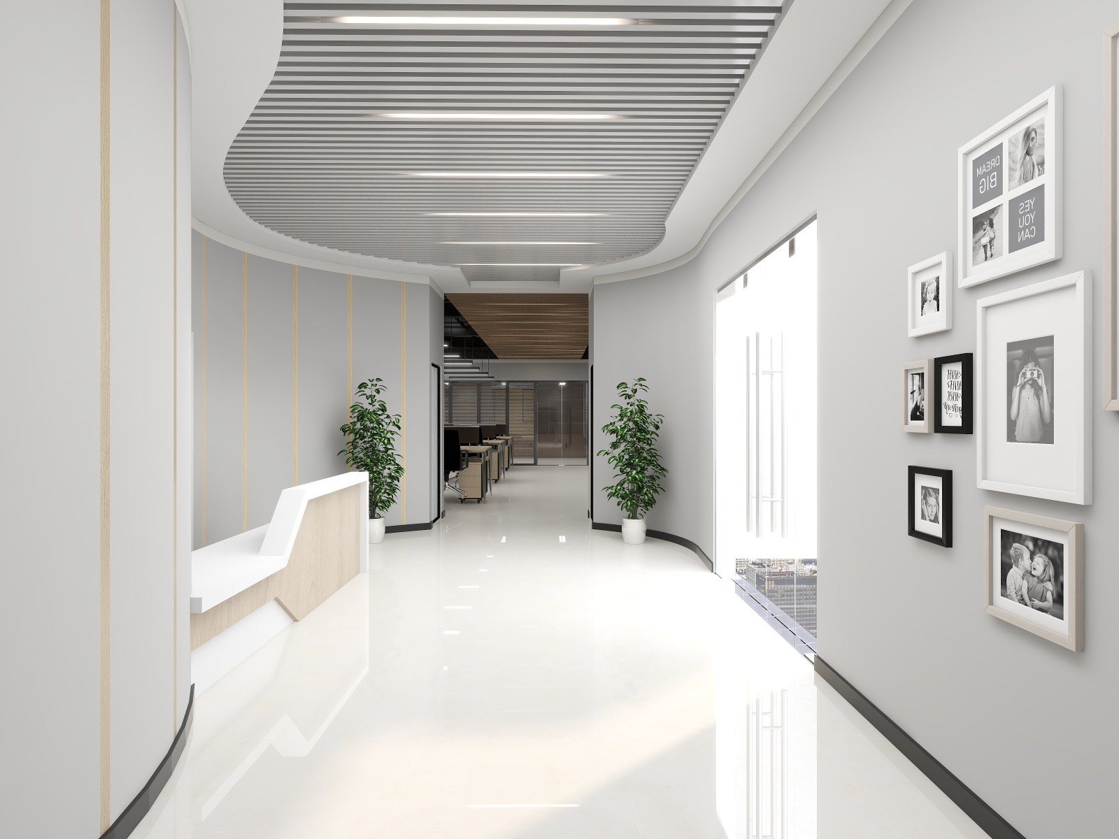 前台采用弧形墙面,顶面用白色铝格栅加石膏板吊顶