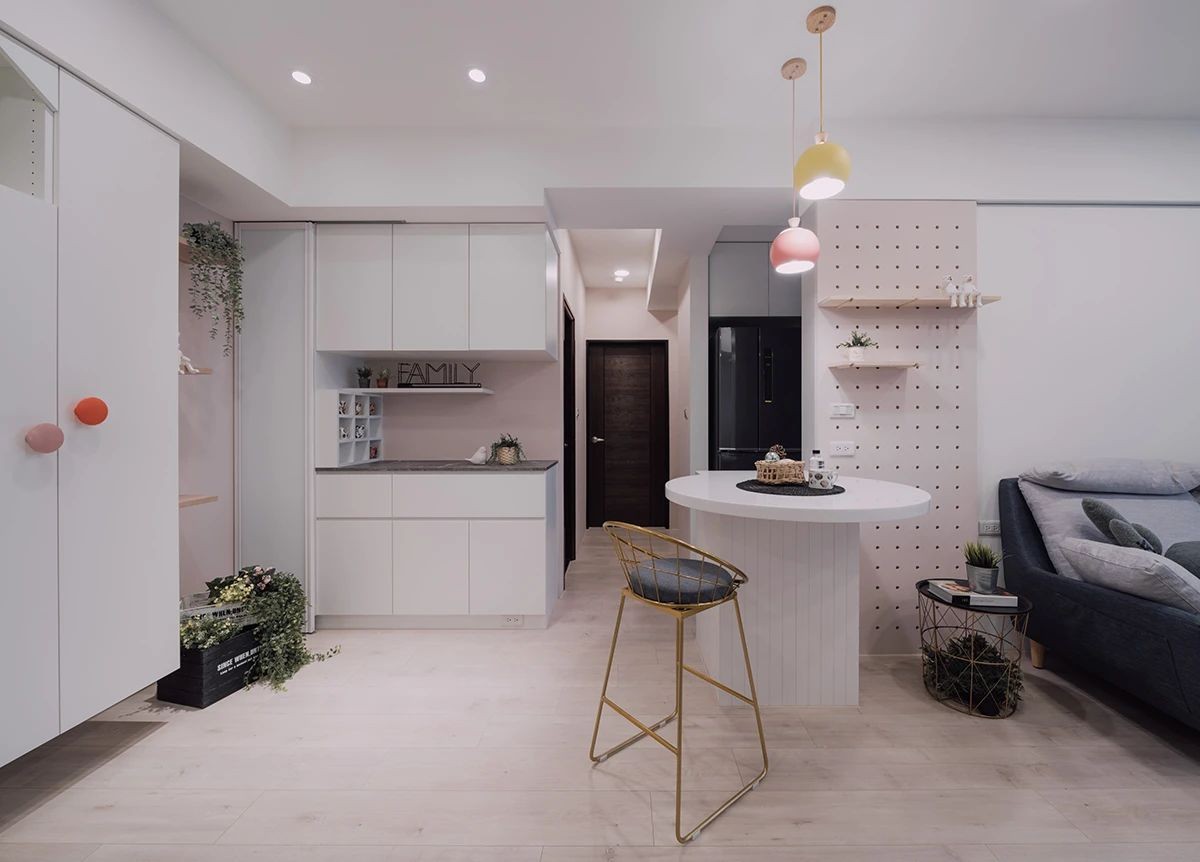面粉色落地洞洞板紧接沙发旁的留白 接应了餐厅嫩粉分布,圆形中岛自厨房推续而出