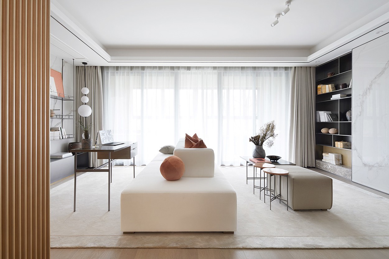 客厅的白色双向沙发,打造双客厅空间 拉通右侧电视背景墙,统一客餐厅背景 主卧门隐藏其中 5米左右的背景墙 既能满足日常收纳空间 又兼具整体的统一性