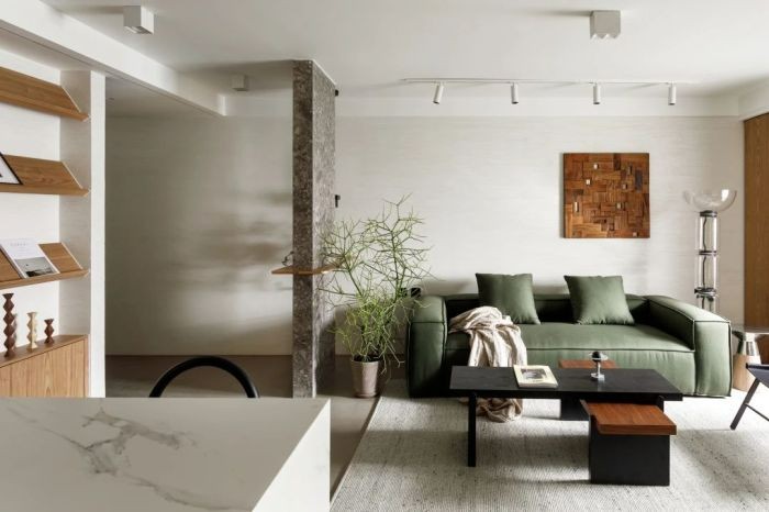 打破了两室一厅的原户型, 将整个封闭的空间尽可能全部打开, 令公共空间的实用性以及开阔度增加不少。在开放的同时,以两组四扇平移推拉门 保证了卧室空间的独立和私密性。