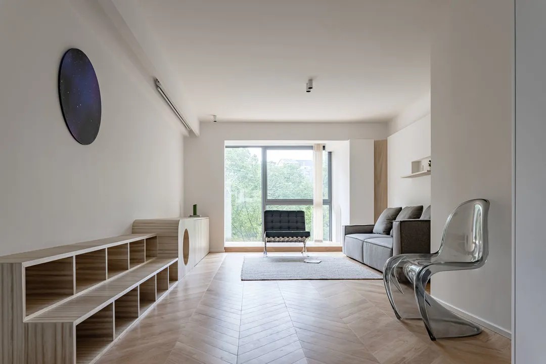 屋主夫妻平日除了紧张的工作氛围,还需要面对形形色色的人群,因此装修要求很明确,简单舒适的装修、轻松舒缓的居家氛围。装修围绕极简风展开,以白色和原木色为主调,营造出一个让人放松的氛围。