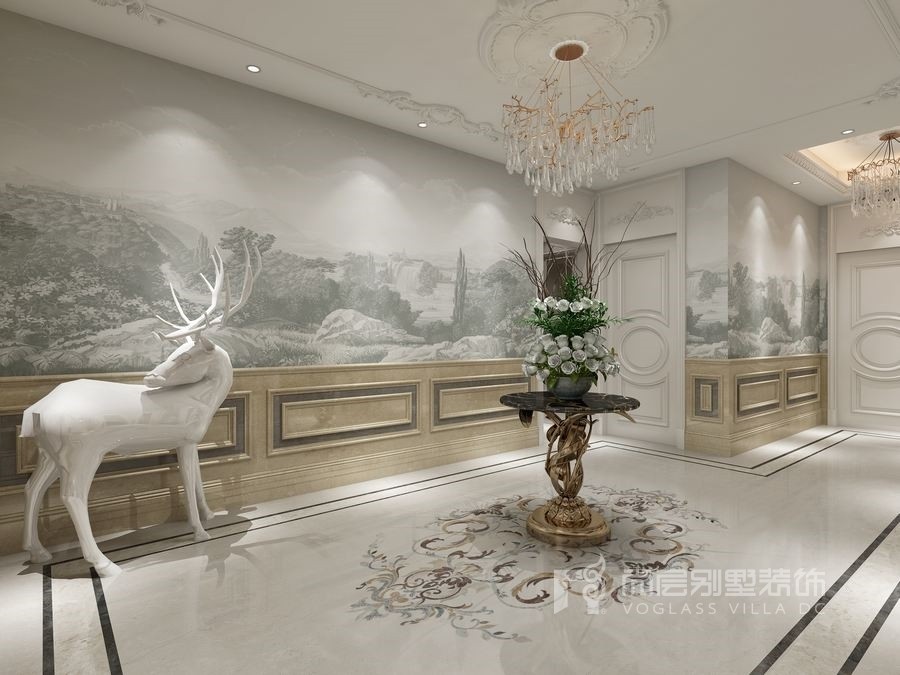 大理石墙裙做装饰。以森林为主题的壁画充满着自然的气息,一直延伸至中厅空间。门厅处白马神俊,向里看去,又见麋鹿回头,踱步林间。