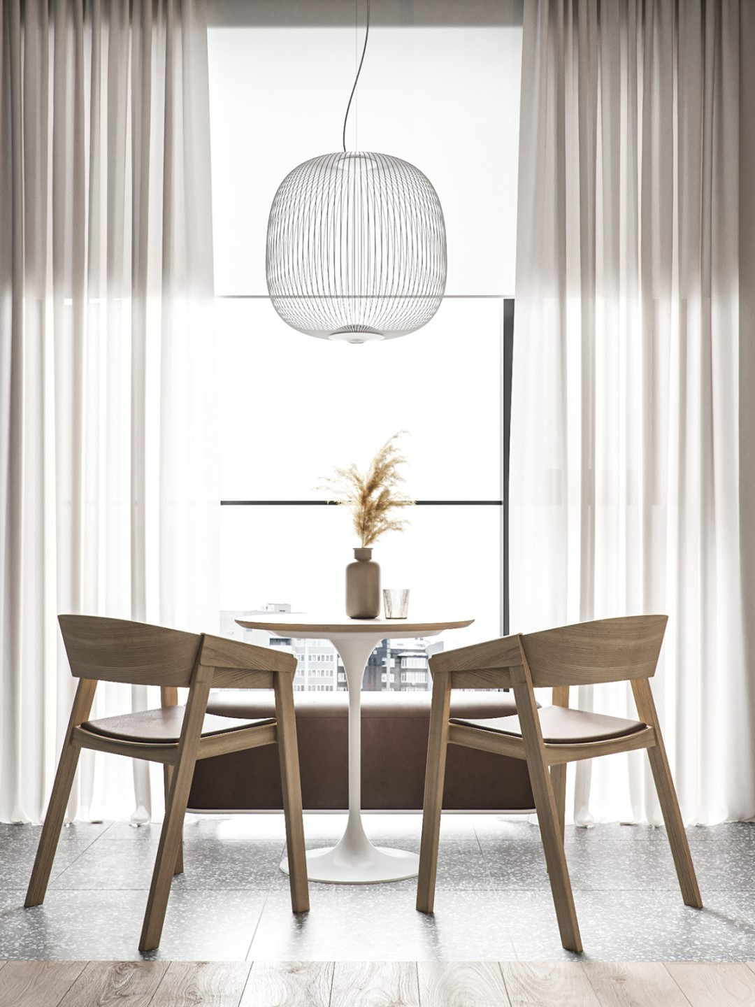 这里摆放一组木质餐椅和长凳,两把木餐椅选用舒适的棕色皮革坐垫,与窗台下的棕绒长矮凳协调一致,上方的线性小吊灯与木条纹相映成趣,看起来十分惬意