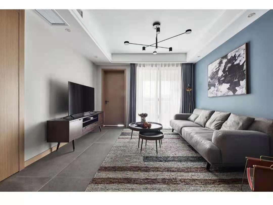 浅灰墙面公共色,质感好的深灰地砖,喜欢的灰色胡桃木,自然的布艺沙发,地毯,窗帘,勾勒出质感家的模样。