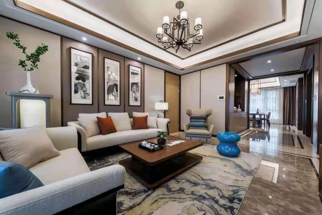 这套作品的风格为中式装修风格。通过提炼中式要素,融入了现代的设计语言与艺术创造手法,整体色调以米色和咖色做为基调,满足温馨的居家需求,软装用冷暖亮色撞色,打破沉闷。