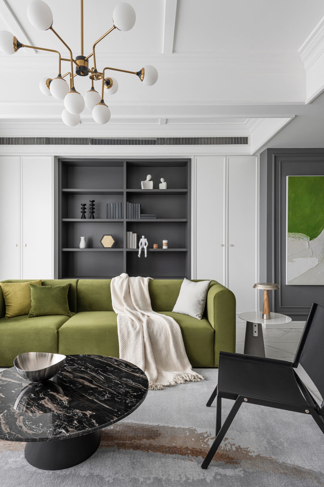 沙发背后的储物柜有开有合,兼并收纳与展示功能,石材茶几为空间融入了更多的自然纹理。