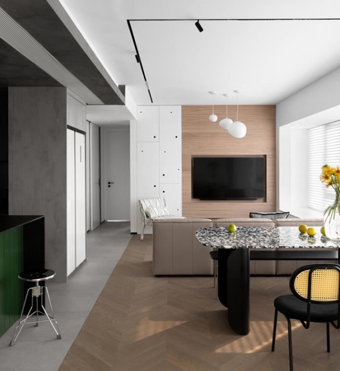 客餐厅虽然在一个大空间,但是我们采用了很多的隐晦手法,不用实墙不用隔断就在视觉上引导着我们自动将各个区域划分开来。地板和顶面我们用灰色瓷砖和艺术漆与客餐厅划分界限,厨房和客餐厅之间是相对独立的。地板:卡斯摩,艺术漆:新时代。