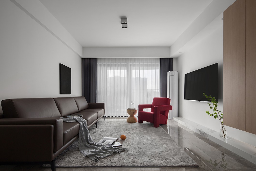 整个客厅的沙发背景墙都刷成了白色,以留白为主,搭配部分木饰面进行点缀,给人一种简洁、质朴的感觉