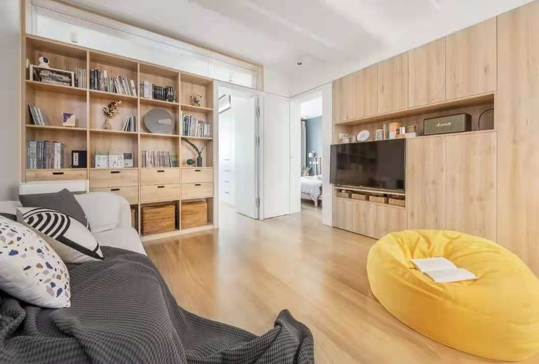 开放+封闭的柜子设计可容纳主人的大量储物需求习惯。简约的造型灯具勾勒出家的温馨感,顶面以曲线造型设计减弱原结构横梁的突兀感。整组开放柜旨在解决全家书籍收纳的需求。女主人和设计师都很喜欢的PH5吊灯。