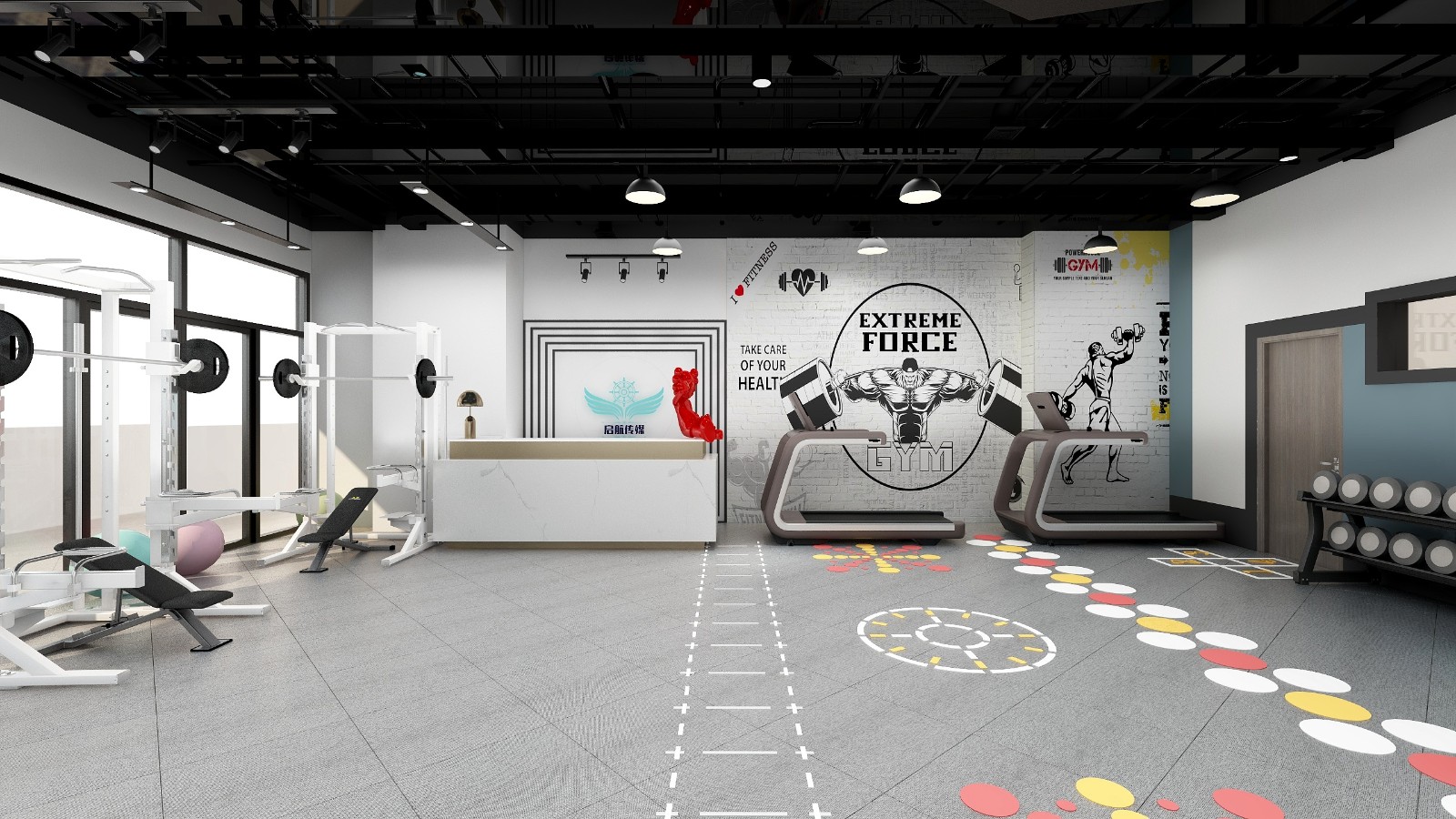 这一面墙体设计采用健身涂鸦,给人一种想锻炼的冲动。