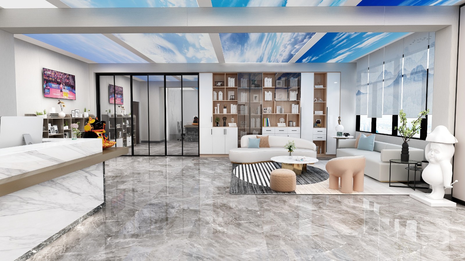 景通广告工厂前厅,风格为现代,顶面采用蓝天白云的发光喷绘布,主要提现出工厂的制作的成品效果,起到宣传的效果