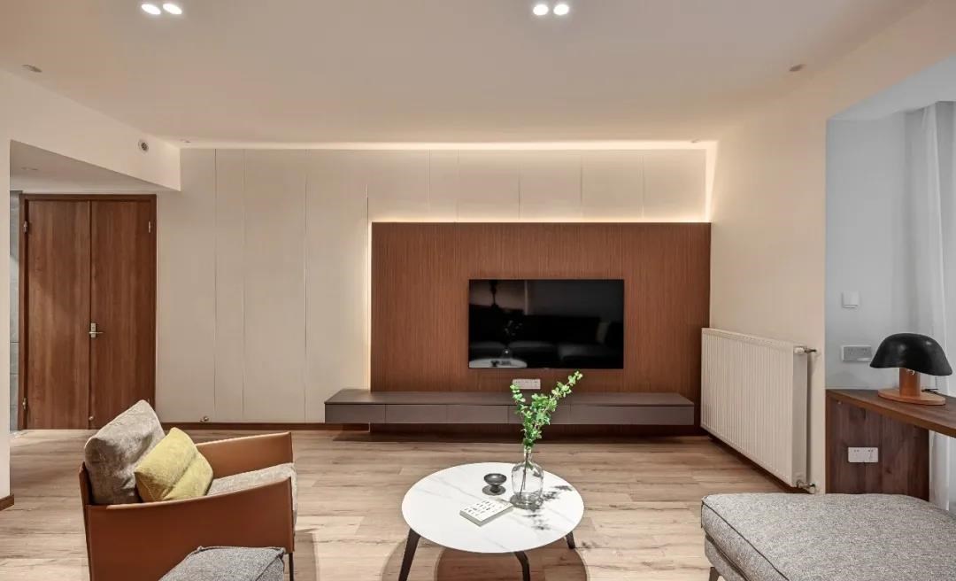 电视墙石膏板拉缝与木饰面结合,形成鲜明对比,更显立体。