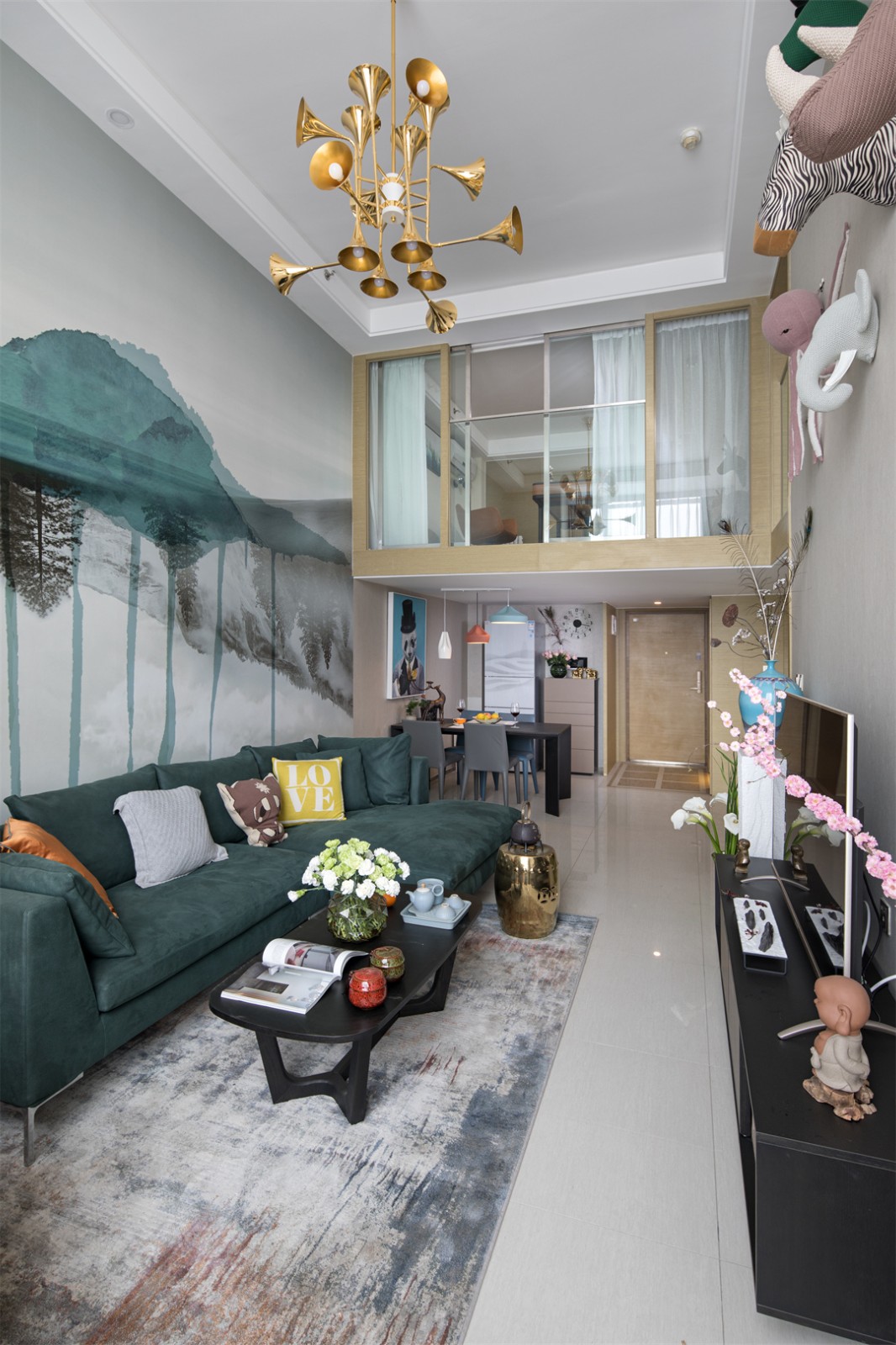 客厅壁纸绘画与电视机前的枯山水摆件遥相呼应,心中有山水,一山一石皆是禅意。电视背景墙与餐厅中的挂画,都用动物元素来加以装饰,严谨中带着一丝趣味。