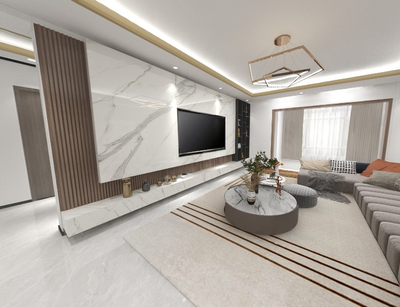 整体风格轻奢风格,顶面采用了不锈钢香槟金色,石膏板直线吊顶,电视墙定制网格栅uv板材,大芯板衬底。