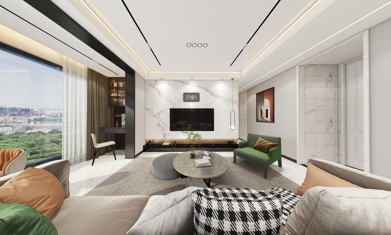 客厅设计整体采用现代简约风格,黑白色系,在原有地面砖不变的基础上,我们对墙面和顶面对了改造,墙面色系偏浅灰色,顶面采用无主灯设计,让整个空间不再像传统吊灯一样对空间层高产生影响,电视背景墙采用岩板为主体,让整个空间富有曾测,质感。