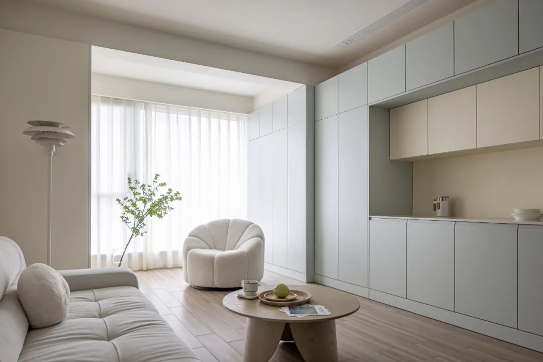 阳台空间归纳给客厅,将洗衣柜和烘干机内置。阳台柜可放置杂物,吸尘器等,也可作为家中鞋类的一个补充放置储藏。