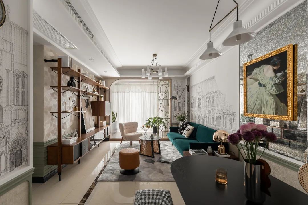 拆除阳台移门,增加客餐厅视野的通透感,墨绿色绒布沙发触感细腻柔软,铜隔断和草编茶几,碰撞出复古混搭的格调,