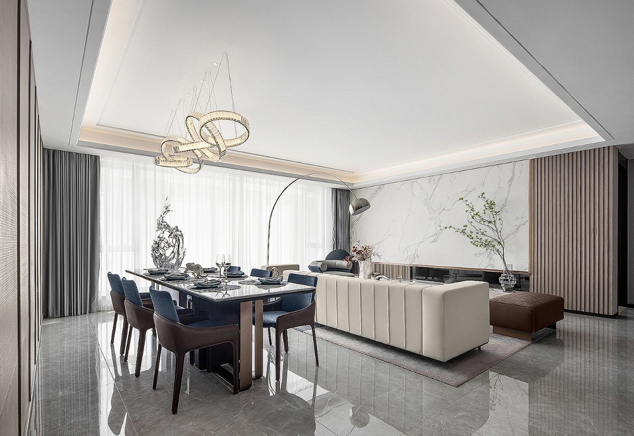用功能将生活场景进行划分:家庭休闲、社交会客、亲子互动、悦享生活、文娱健身、悦享时光。从聚餐到游戏,从运动到读书,有人间烟火,亦有诗和远方。更强调在“厅”这个空间内,去承载更多的居住可能性。 割,温润的木质与柔和的面料优雅过渡增加空间的流动性。