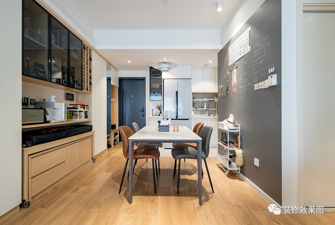 餐厅,整排的收纳柜让家里的每一寸地都没有被辜负。白色与木色的经典配色让空间明亮清爽,黑色的展示柜与黑板墙色调呼应,增加了一丝趣味,让家里具有更多的可能性。