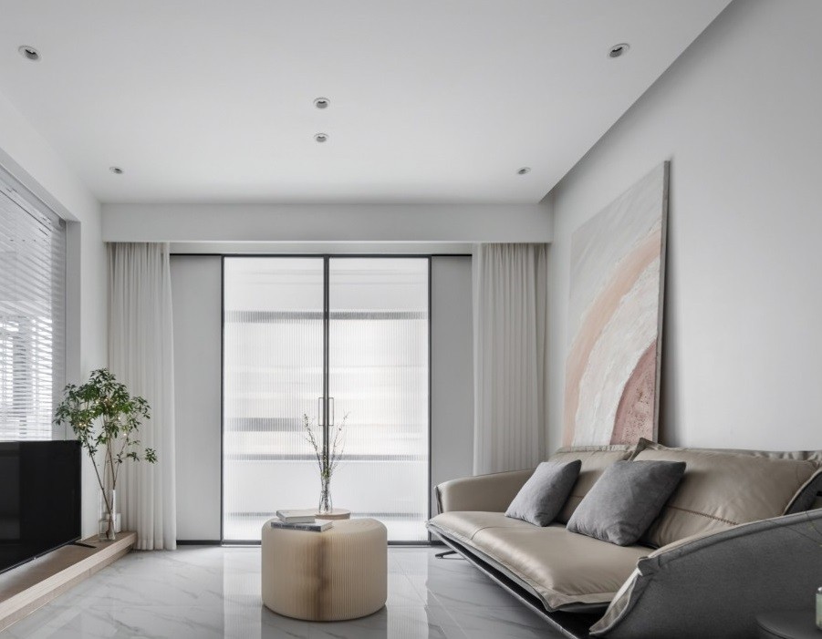 平面吊顶,通铺大理石地砖,延续性的纹理增加空间的纵深感