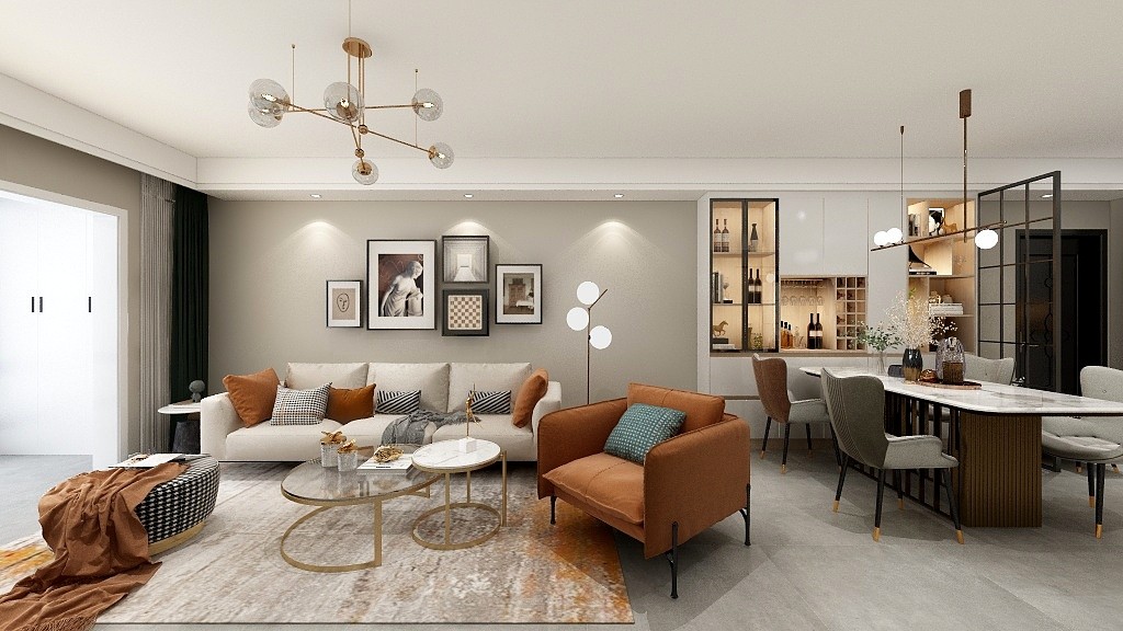 客厅有一种画报的既视感,时尚中带有些许内敛,质朴中蕴藏暖意。
