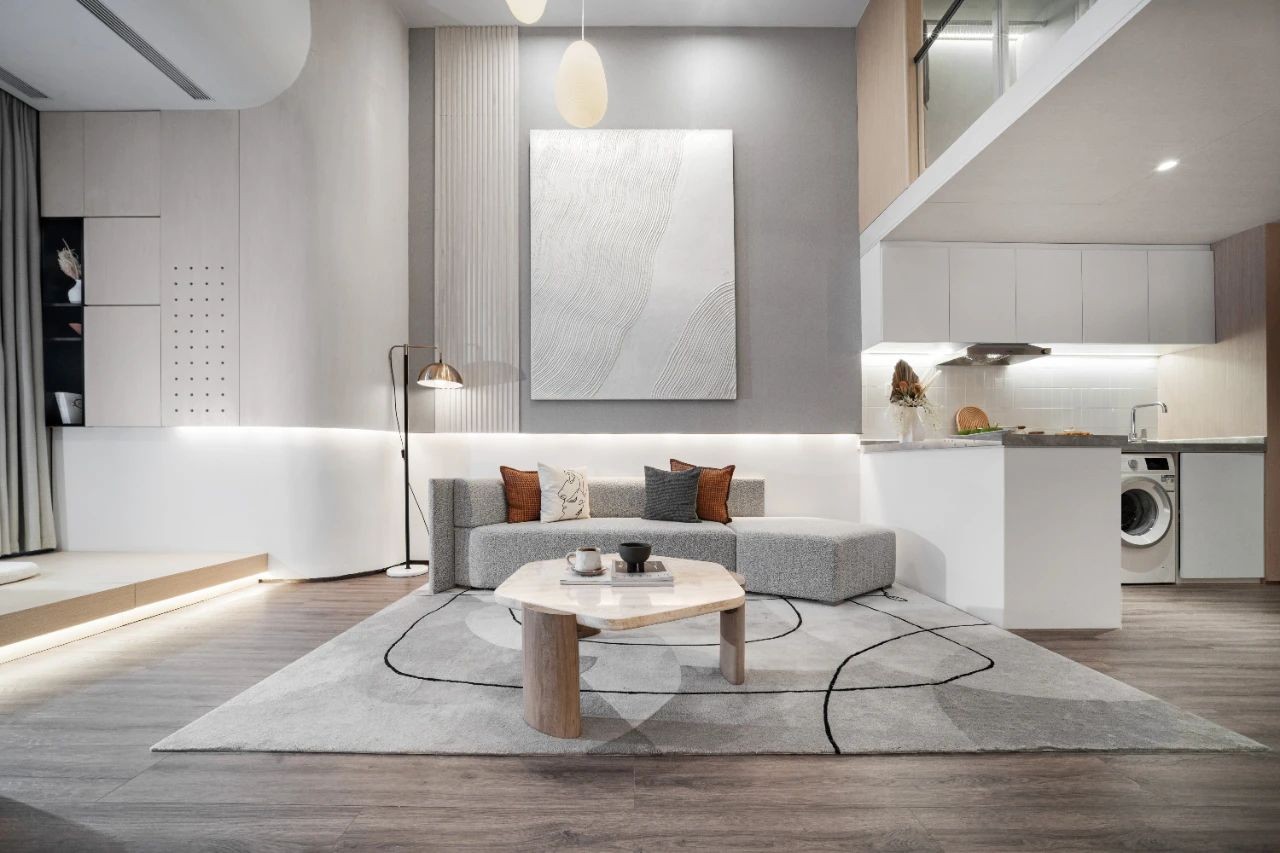 客厅以米白色、暖灰色,木色为基调,轻柔的色调变化,独具一格的挂画,金属式样的暖光灯,极具暧昧气息的茶几,搭配精致的装饰不只是素雅美,还萦绕着优雅清朗的调性。