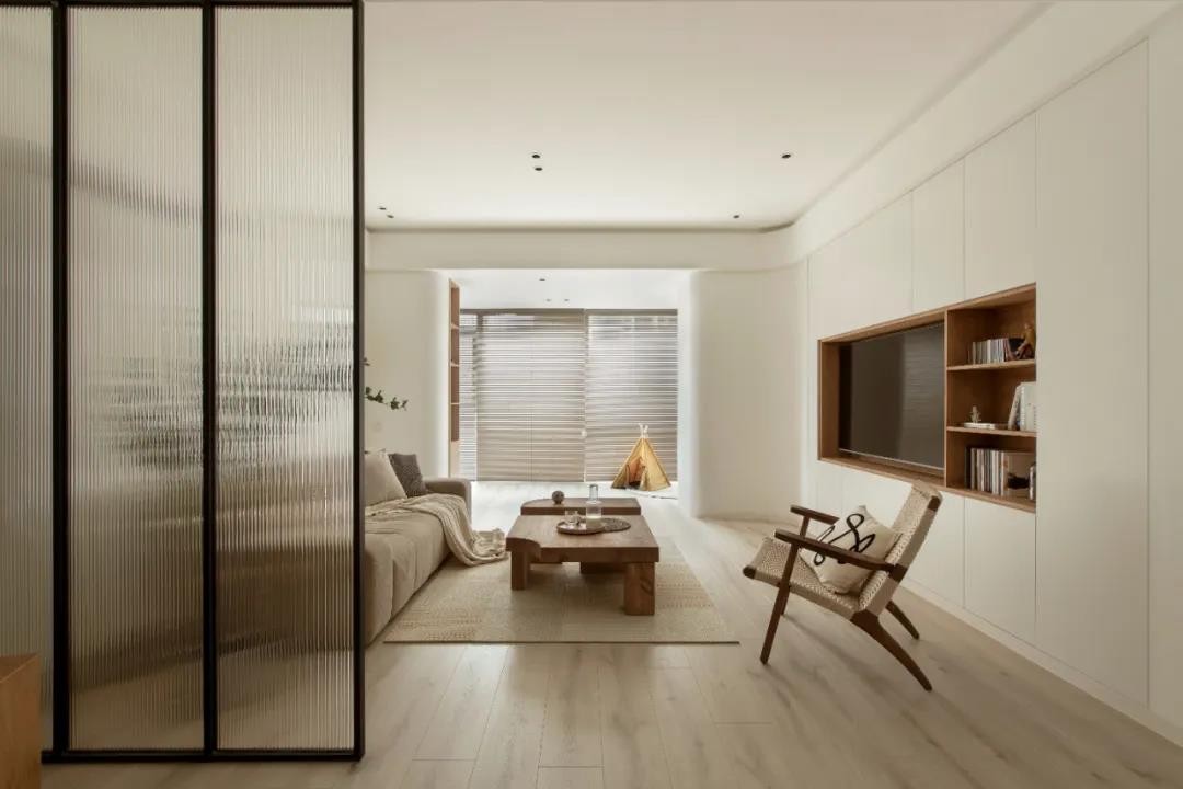 在墙体中嵌入竖条灰玻,减少墙体给视觉带来的拥堵。而背面的空间也能成为一幅可变的的画面,卧室与公共空间互动性更强。