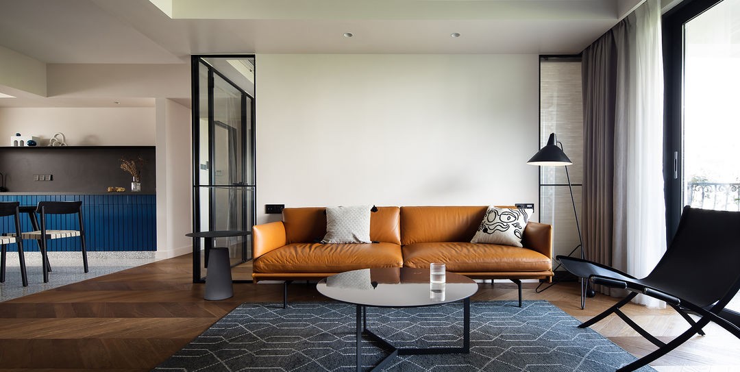 客厅通铺人字纹木地板,温润的质感与餐厅形成材质上的空间划分,克莱因蓝与爱马仕橙的张扬对比,一面沉静温婉如女主,一面热情健谈如男主。