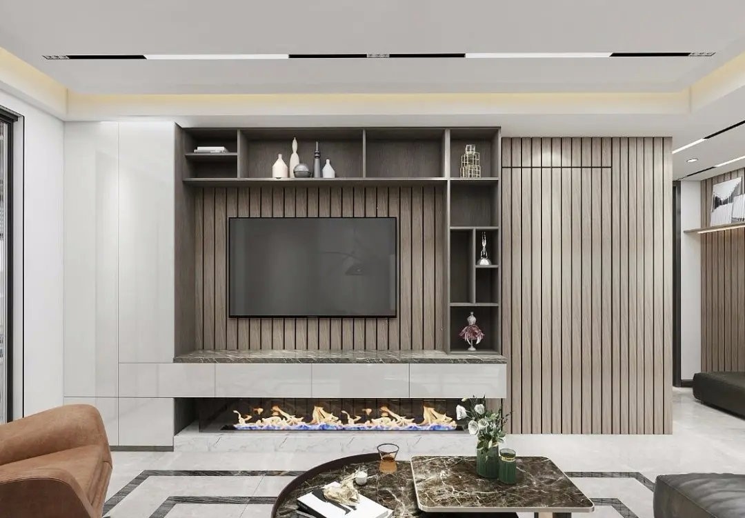 客厅设计简洁明了,电视柜与护墙板的结合使得空间看起来开阔,回字形开放柜体使收纳更加灵活。