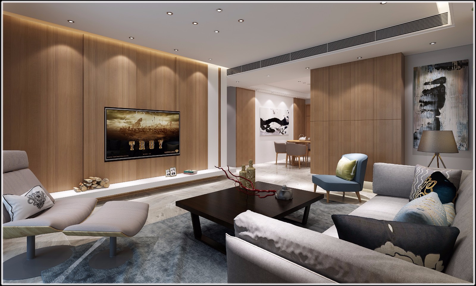业主需求是需要一个简单大气的家,很合适作为现代风格简单大气,墙面加上木饰面与柜子的点缀,展示出简约而不单调的风格