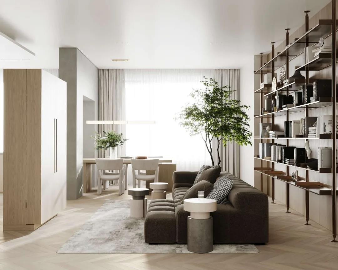 光线充足的横厅开放疏阔,原木所营造的优雅基调统摄整体风格。在其影响下,现代家具的排布节奏轻快、灵动,点润日常生活的理想场景
