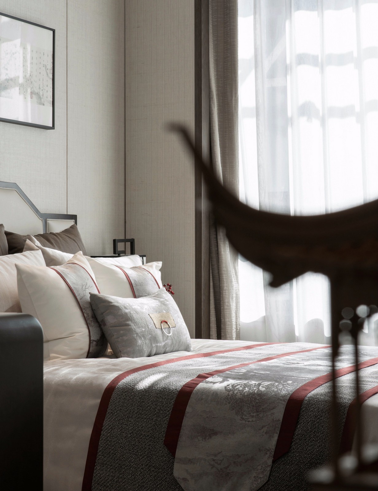主卧室整体采用灰色调,深灰色的壁纸纹理细腻。床头的环形吊灯设计感极强。