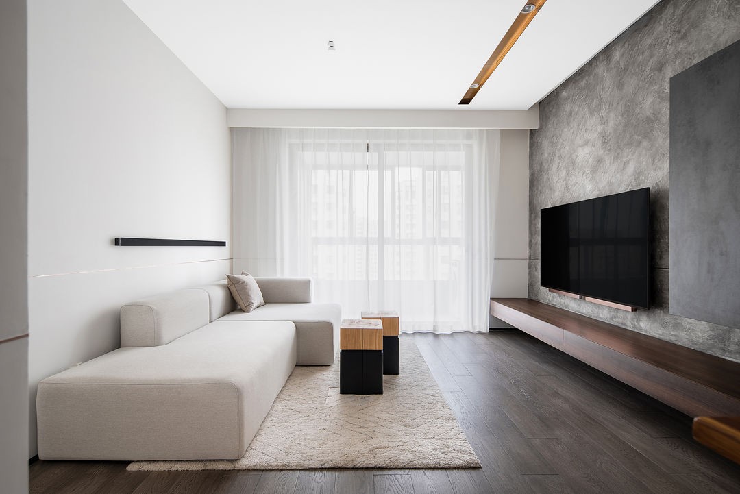 沙发背后的条形灯,增加了晚上光源的多样性,也让客厅晚上更加温馨。棉麻质感的沙发增加了空间的柔软性。
