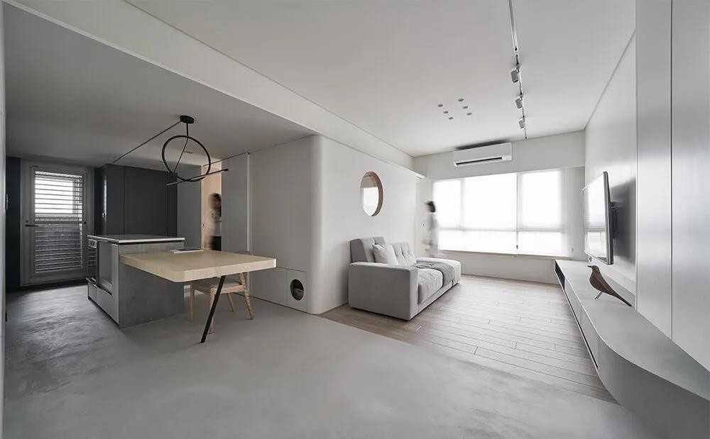 柔和的光线营造了温馨的氛围, 留白的空间成就了简约的空间。 原木色与灰色的点缀, 体现了他们对生活的理性与沉稳