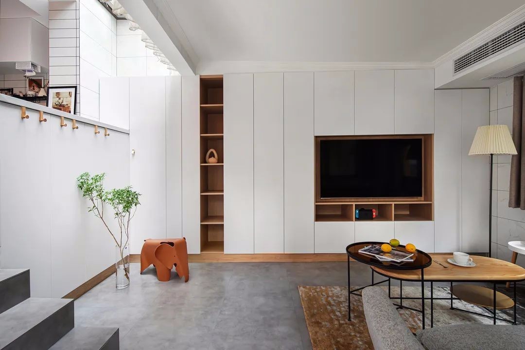 电视背景墙收纳功能强大,门板考虑美观性没有设计拉手
