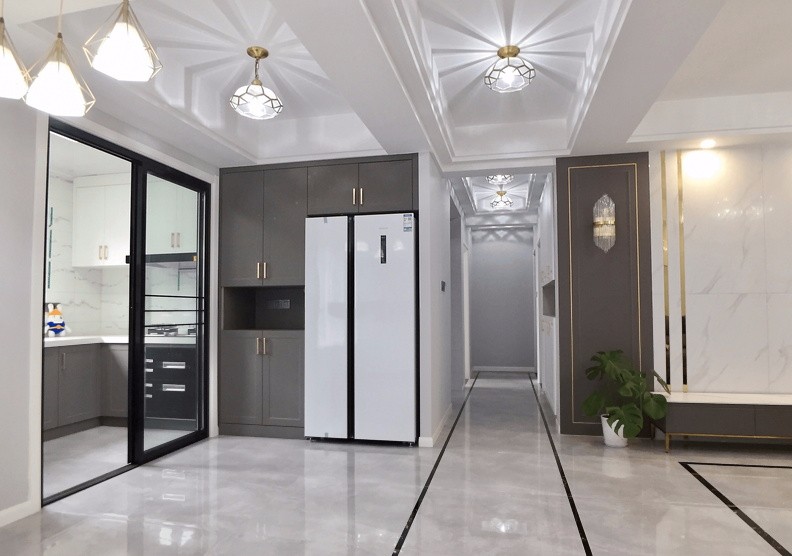 过道吊顶及波导线自然分隔出客餐厨空间,开放式的设计让各领域连接在一起,让视觉上得到“大户型”质感。