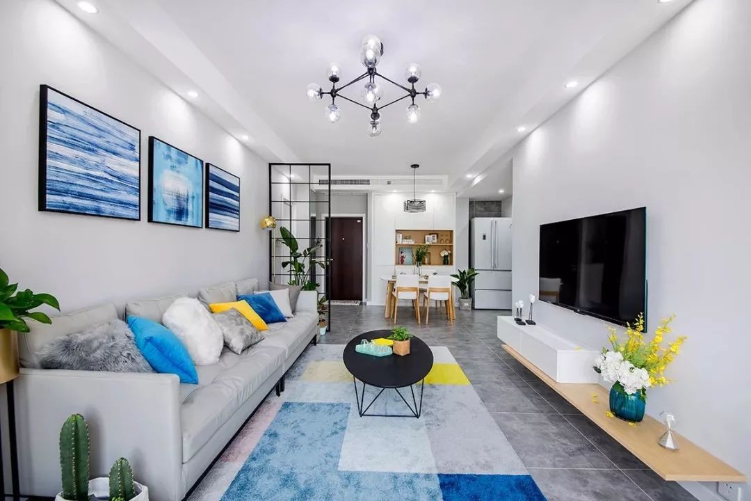 客厅以灰、蓝、黄三个颜色为主,亮色作为点缀,小阳台设计成榻榻米,休闲惬意。