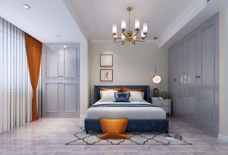 主卧以冷色调来得以呈现,高冷而不失温馨,硬朗不失气质,装饰画和吊灯点缀的亮色,既打破了空间的沉闷,又实现了视觉的平衡