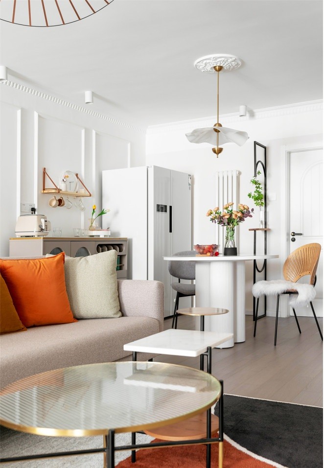 摒弃笨重茶几,以小边几代替,屋主可以按照需求将边几随意摆放,空间灵活性更强。边几几面为透明玻璃材质,为居室注入一抹轻灵