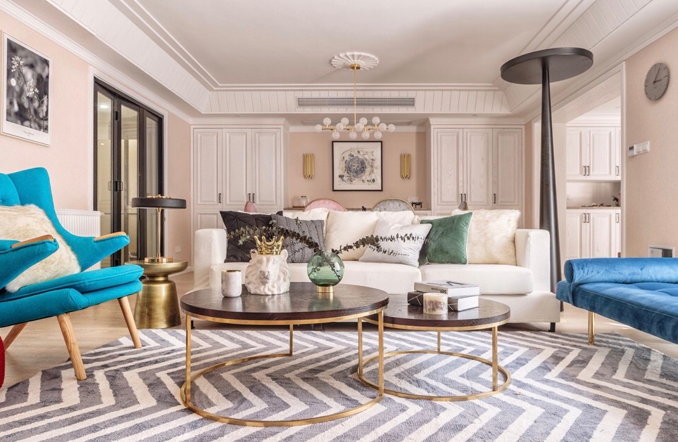 米色的沙发+蓝色的单人椅,搭配地毯,还有一大一小的茶几组合,布置在这个闲适自然的客厅里。