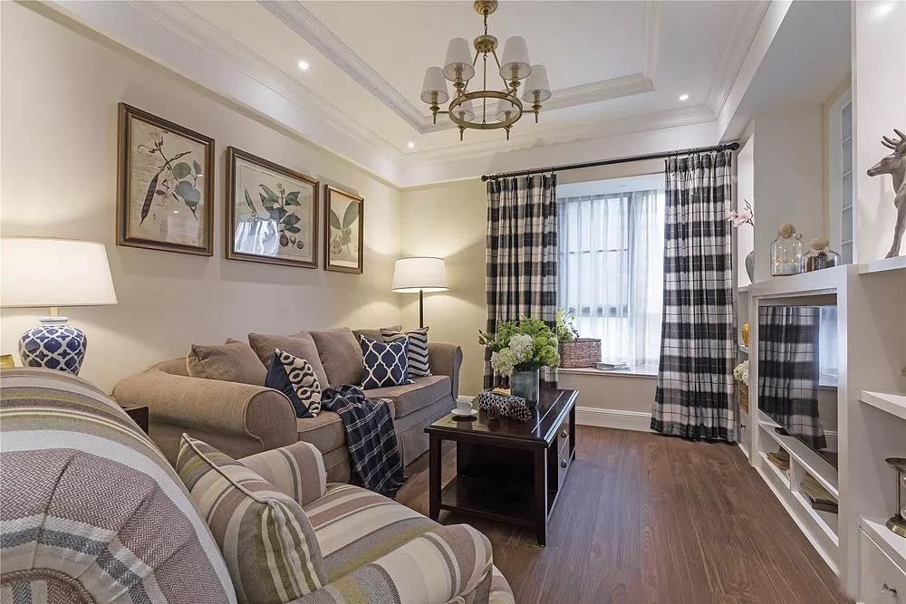 棉麻感的布艺沙发加入蓝白元素的抱枕和小毯子,温暖而舒适。