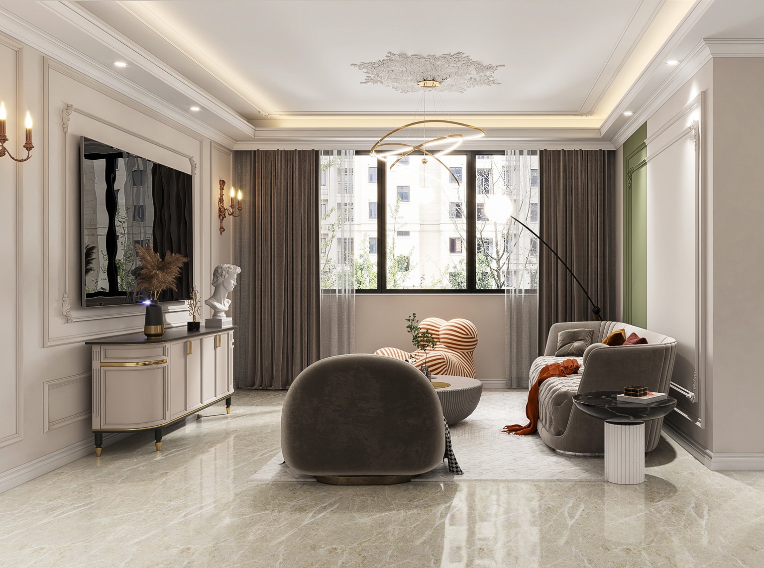 整体以优雅端庄的空间,搭配上华丽雅致的颜色与软装布置,营造出一种低调高冷的档次与华丽气质。