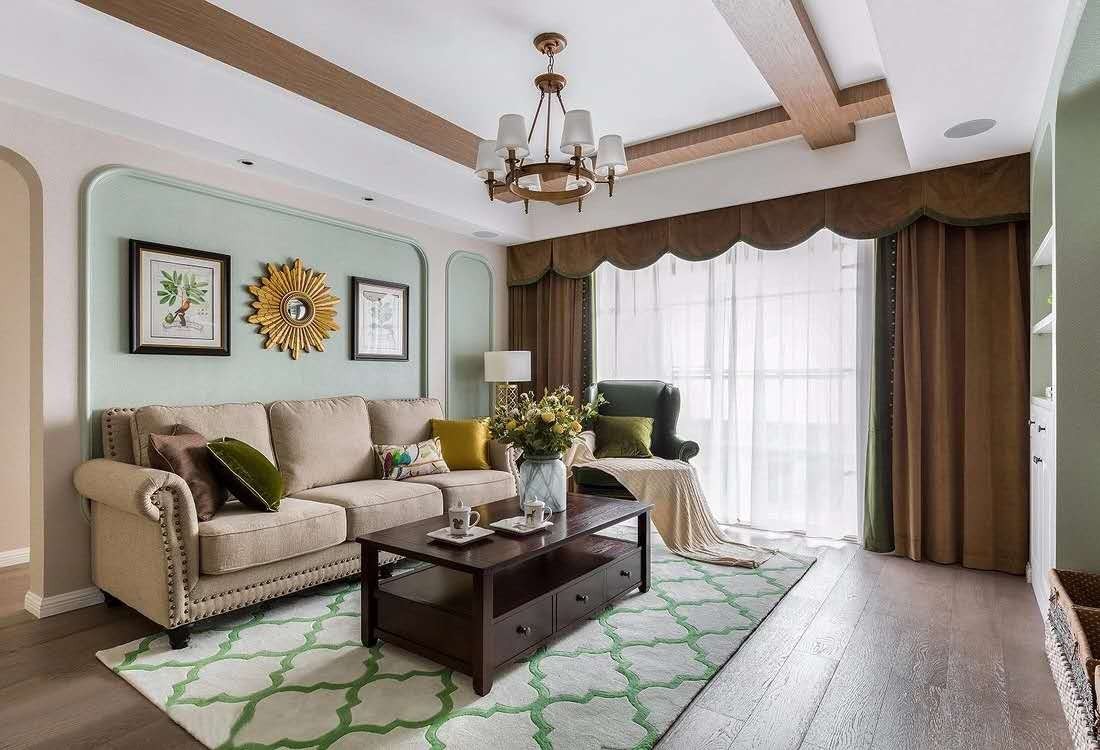 薄荷绿的墙面搭配卡其色的布艺沙发,清新自然。墨绿色单人沙发临窗而立,优雅复古而不失品质感。