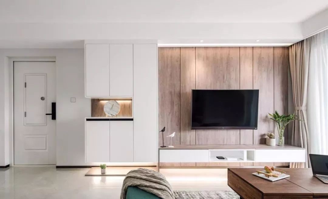 电视背景墙铺上了木板,电视柜也做了悬空的设计,底部同样加上藏光,吊顶内也做了筒灯,合理的光源搭配白色和木色的设计,让客厅显得更加舒适和明亮。